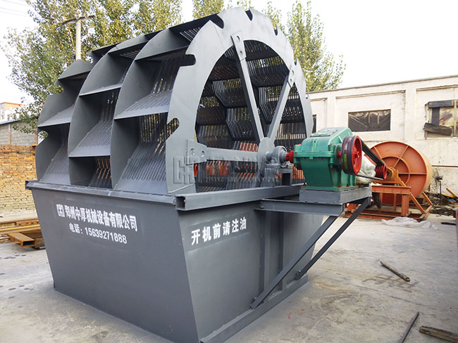 輪斗洗砂機工作時,電機通過三角帶、減速機、齒輪減速后帶動葉輪緩慢轉(zhuǎn)動,砂石有給料槽進入洗槽中,在葉輪的帶動下翻滾,并互相研磨,除去覆蓋砂石表面的雜質(zhì),同時破壞包覆砂粒的水汽層,以利于脫水;同時加水,形成強大水流,及時將雜質(zhì)及比重小的異物帶走,并從溢出口洗槽排出,完成清洗作用。干凈的砂石由葉片帶走,砂石從旋轉(zhuǎn)的葉輪倒入出料槽,完成砂石的清洗作用。