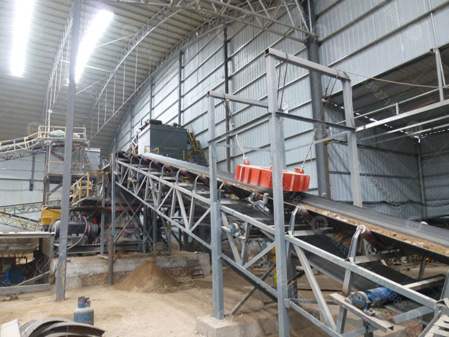 該制砂生產(chǎn)線原料為河卵石,設(shè)計時產(chǎn)量200噸,原料河卵石由運輸車從河道運到料廠,然后通過料倉均勻送到PE750*1060顎式破碎機,進行粗破,粗破后的物料進入單缸440圓錐破碎機,圓錐破出來的料送到振動篩,振動篩上料再回到HP300多缸圓錐破碎機進行制砂,從多缸圓錐破碎機出來的料,再次進入振動篩內(nèi)篩分,篩分出滿足要求的砂子,進入洗砂機進行清洗,清洗后由成品輸送機輸送出既成品。本制砂生產(chǎn)線形成2段閉路循環(huán),采用單缸圓錐破碎機和多缸圓錐破碎機配置,出砂率高、易損件少!